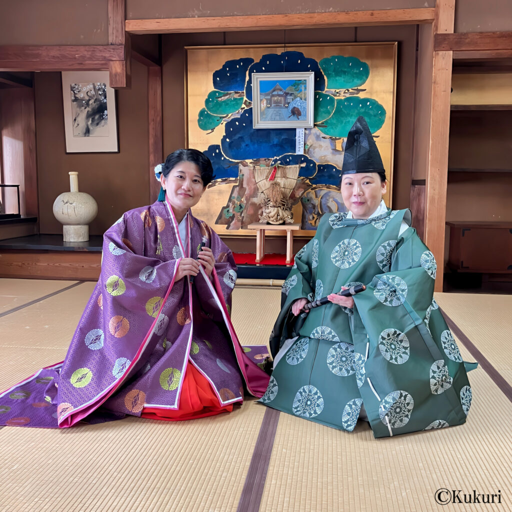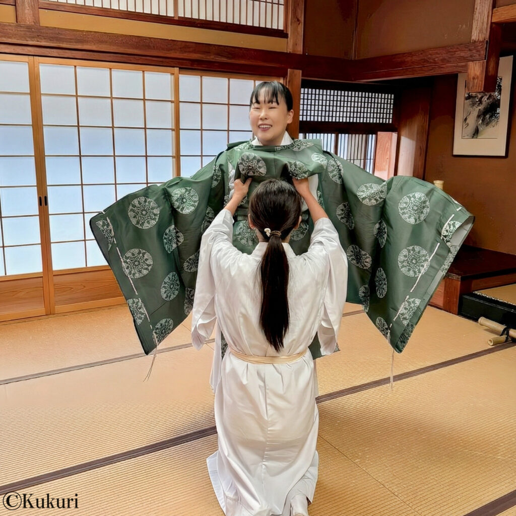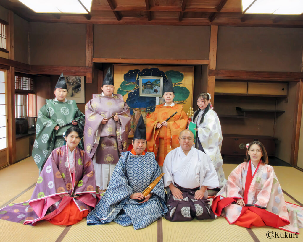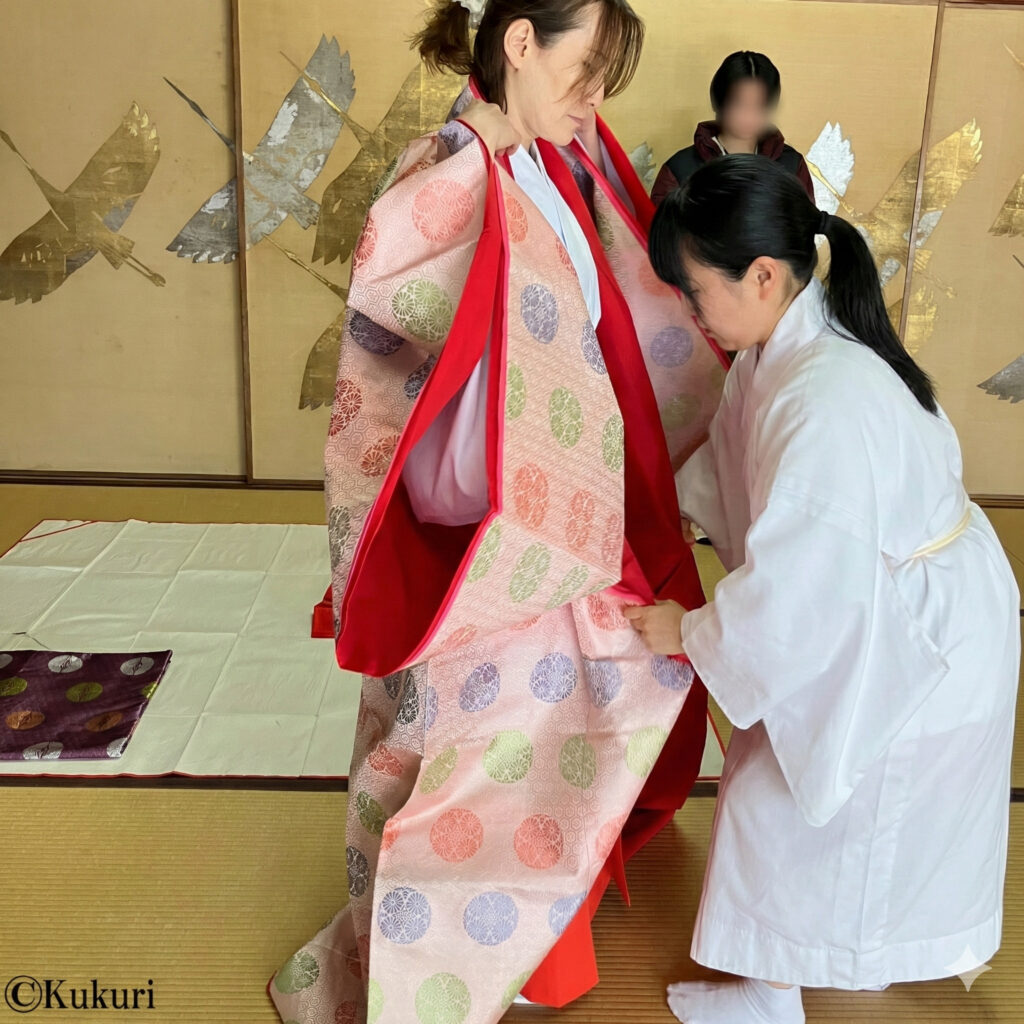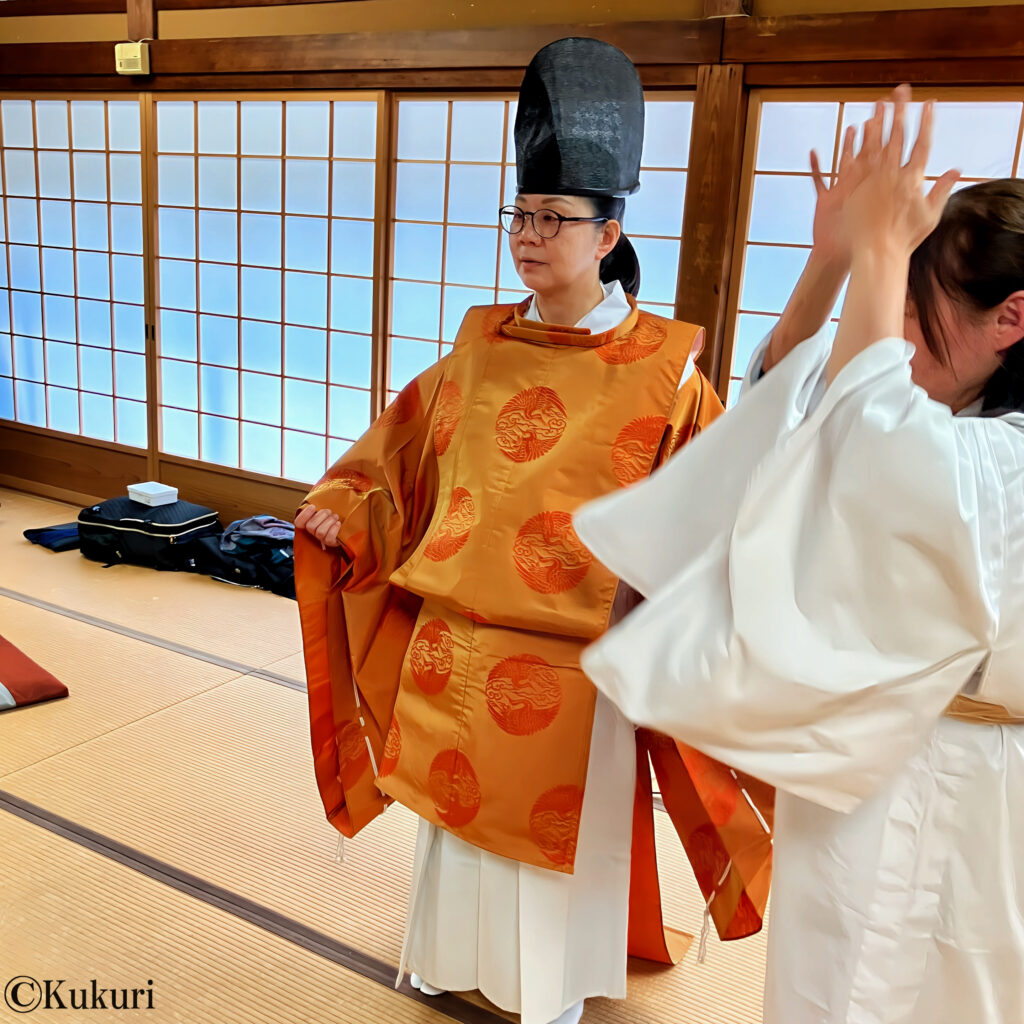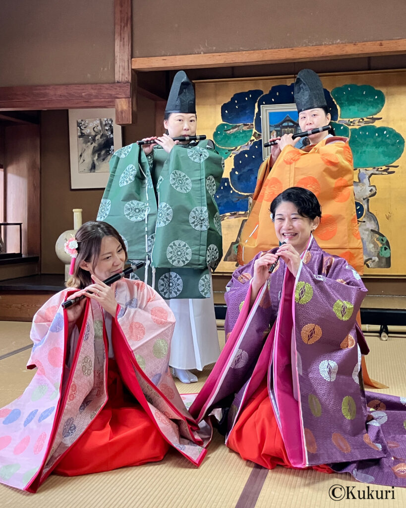 そして何より見た目が美しい!今回の参加者は5名で、その内1名は自前のマイ装束。あとの4名は、千里のワークショップをプロデュースしている「雅楽二重奏 菊理」のレンタル装束です。