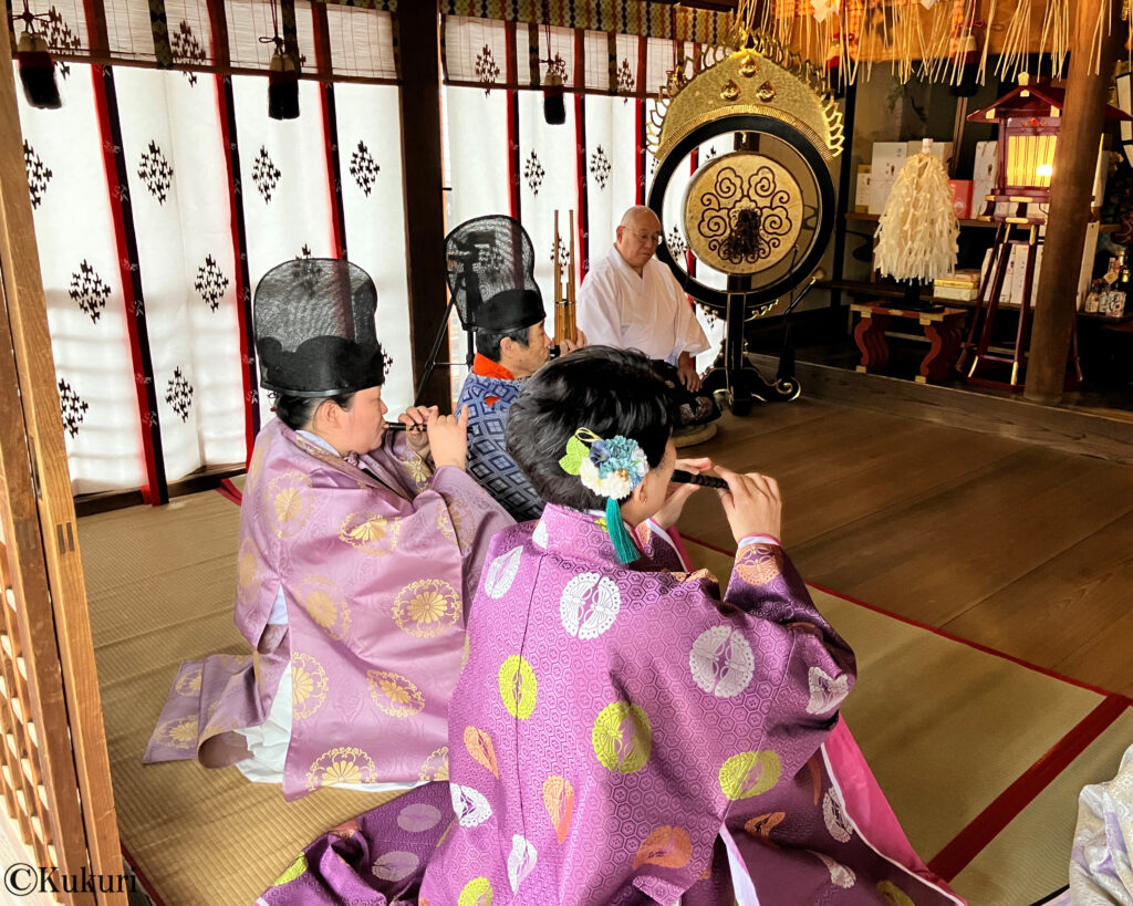 さていよいよ演奏本番。神主様の祓詞、お祓い、代表者の講師の玉串拝礼に併せて一同拝礼といった正式参拝に続き、姿勢を正し楽器を構えます。緊張マックス! 一呼吸置いて静かに龍笛の音色が響き渡りはじめました。
